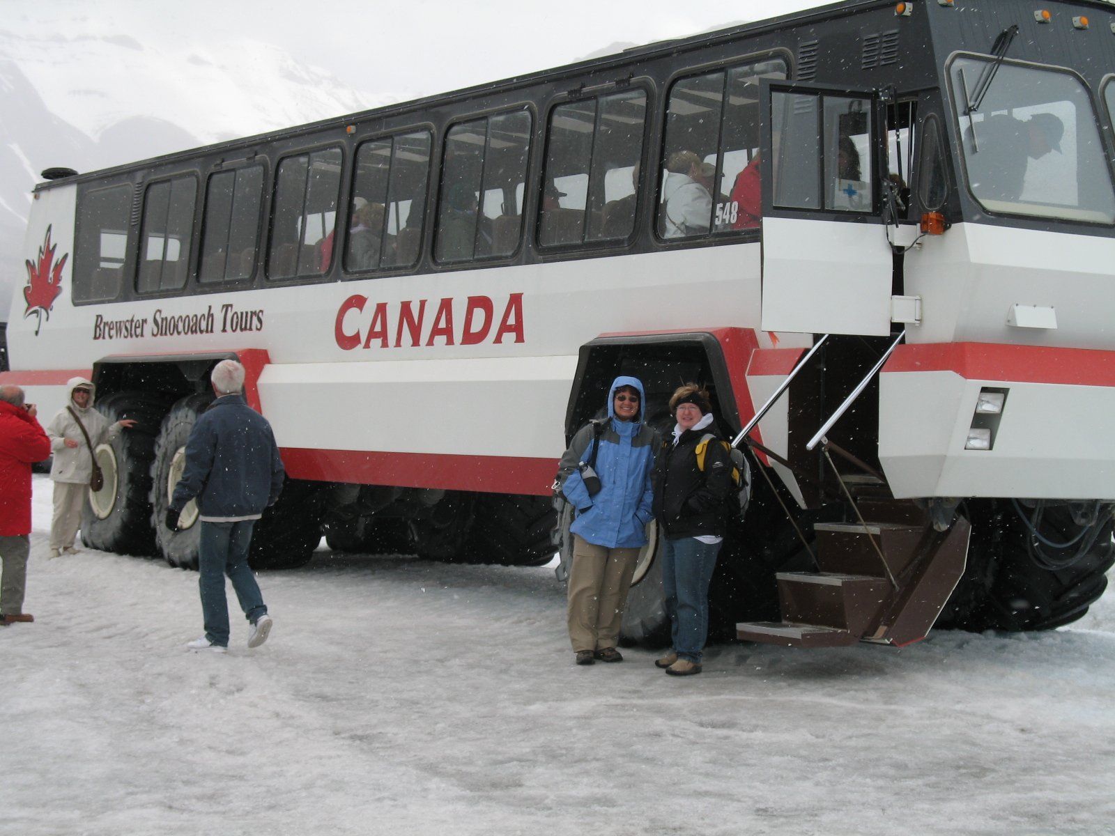 At the Ice Field we bought tickets to ride out on a Glacier. They have special buses that take people out on the Glacier we we got out and walked around. We drank 10,000 year old Glacier melt. While we were on the Glacier it started to snow.