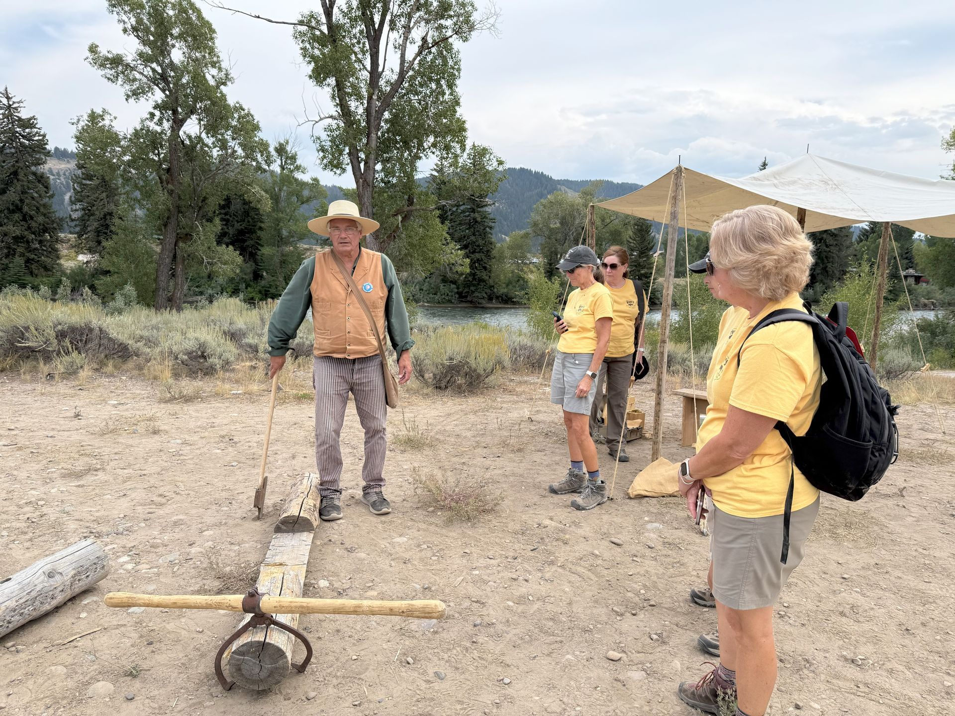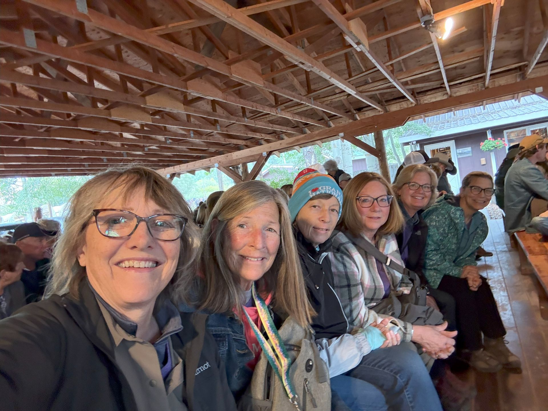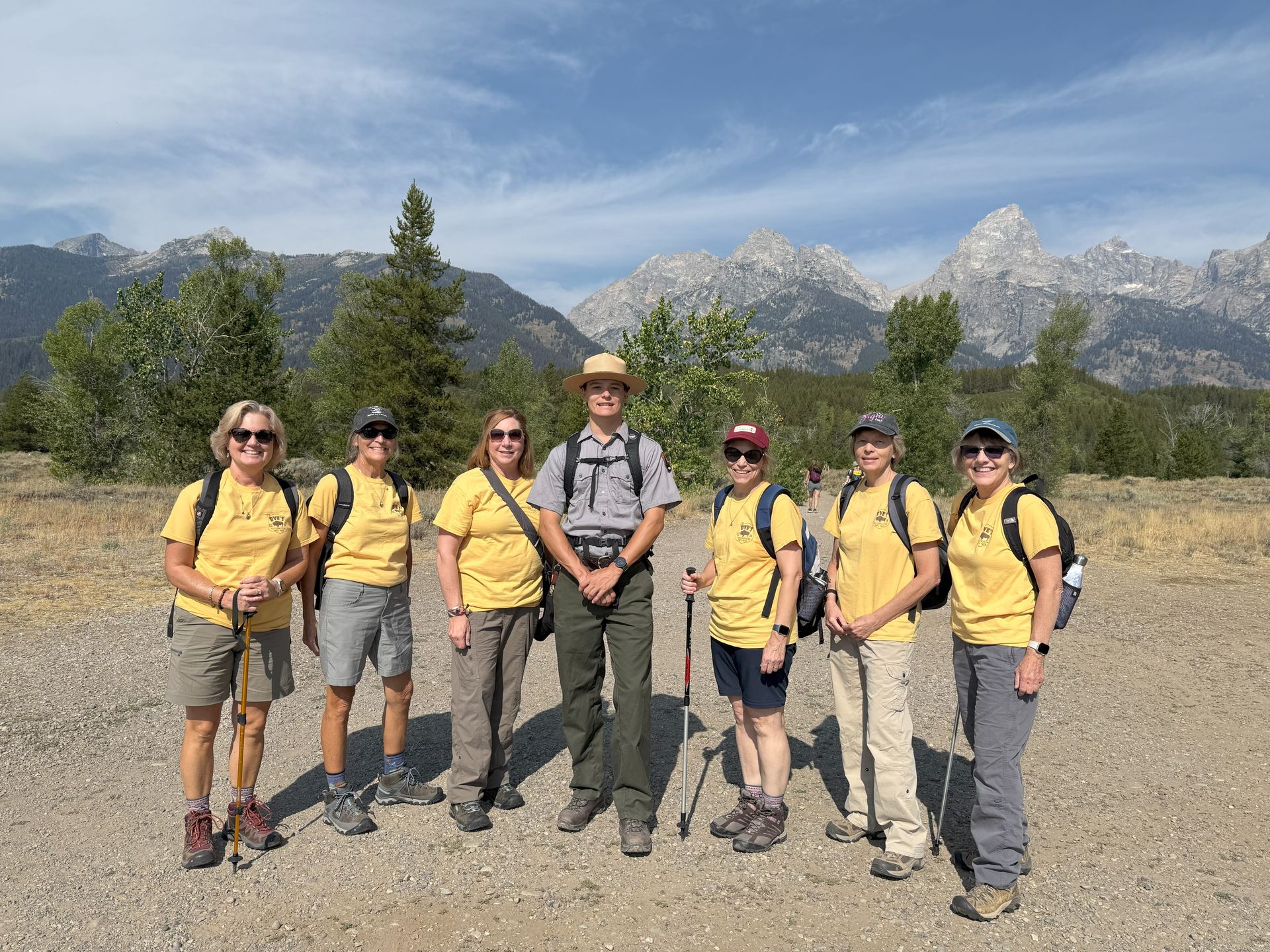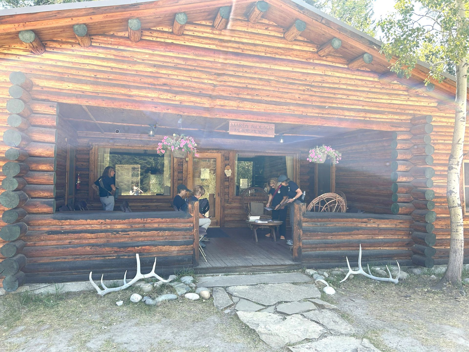 We stopped for a group shot out side of Visitor Center with the Tetons in the background. Then we took a short hike to the Murie Ranch. This was the home of conservationists, ecologists and married couples Mardy & Olaus Murie and Adolph and Louise Murie. It now has 17 rustic cabins and hosts visitors. When we were there a new group of Scholars from all over the country were arriving to spend a week at the Ranch.