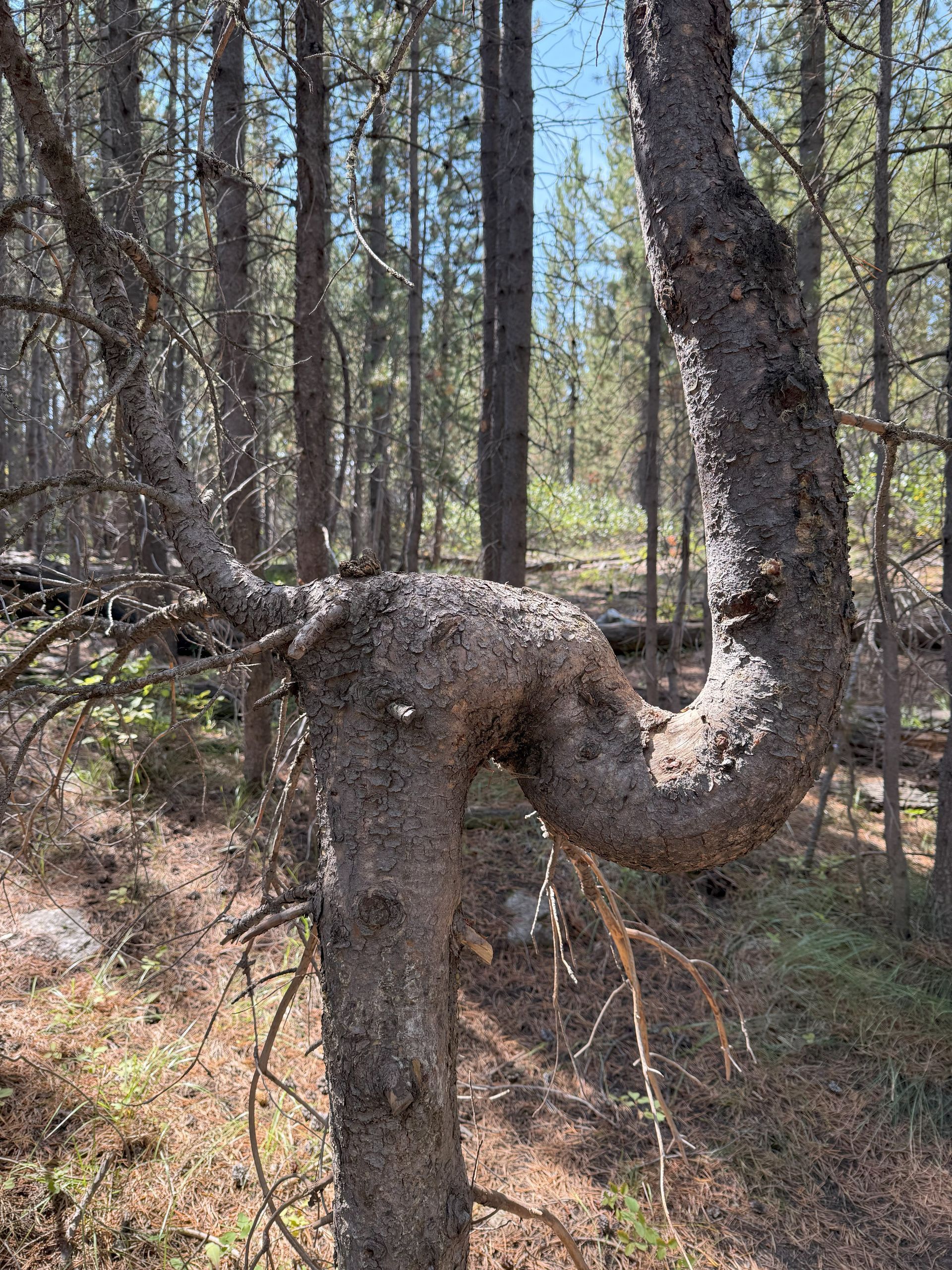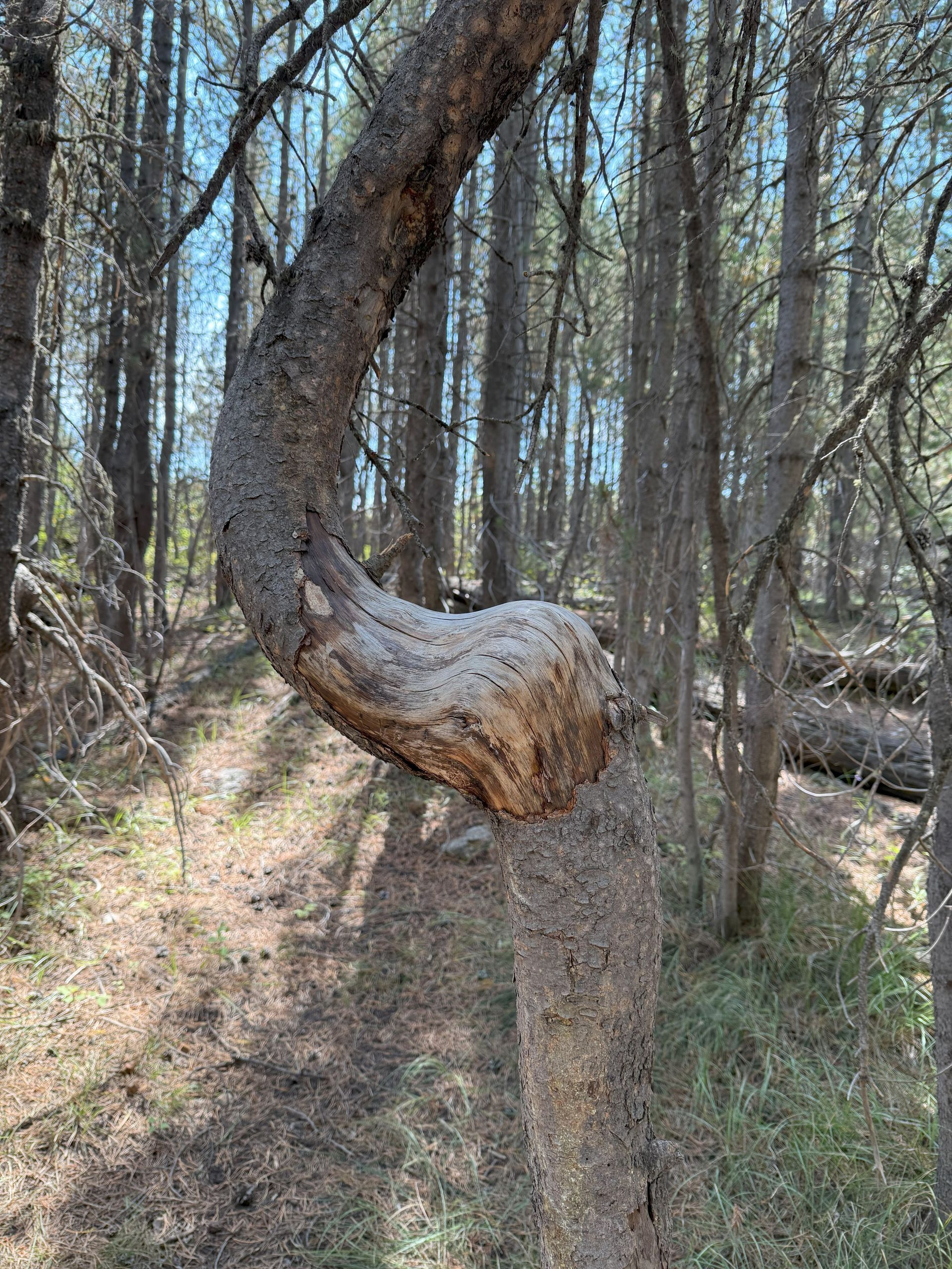 Along this trail we kept noticing these trees that grew with strange bends. We never did find out what caused this.