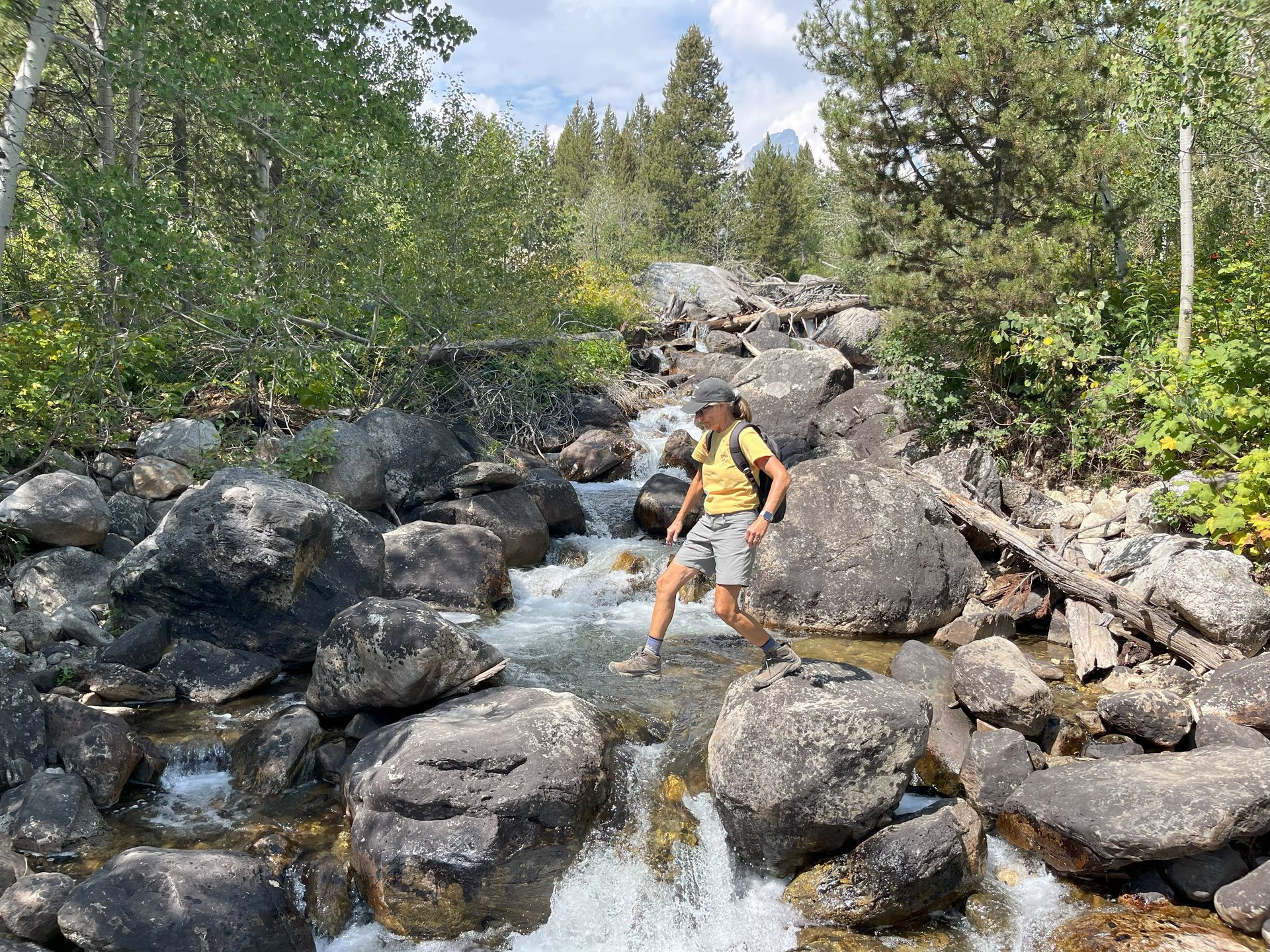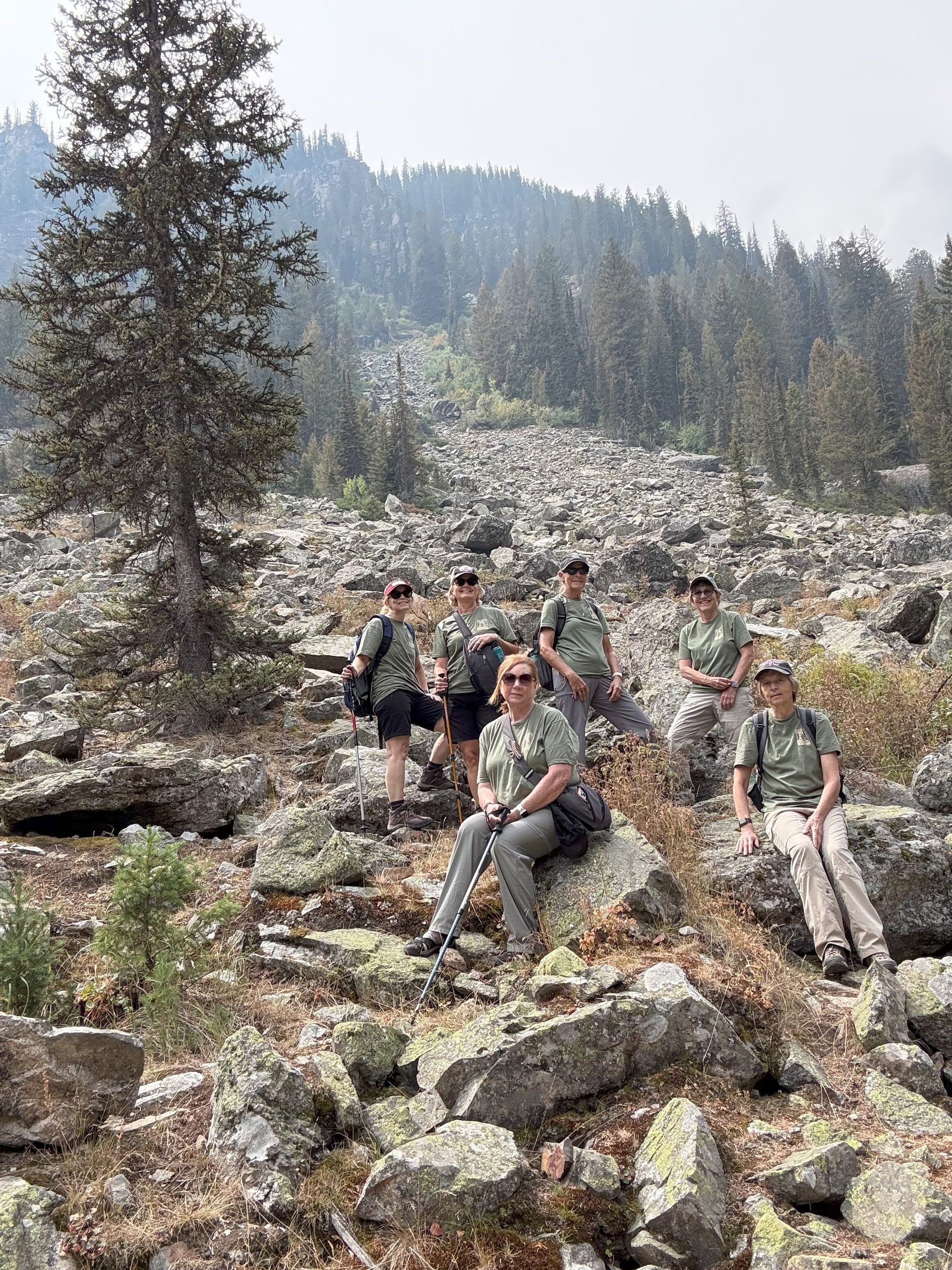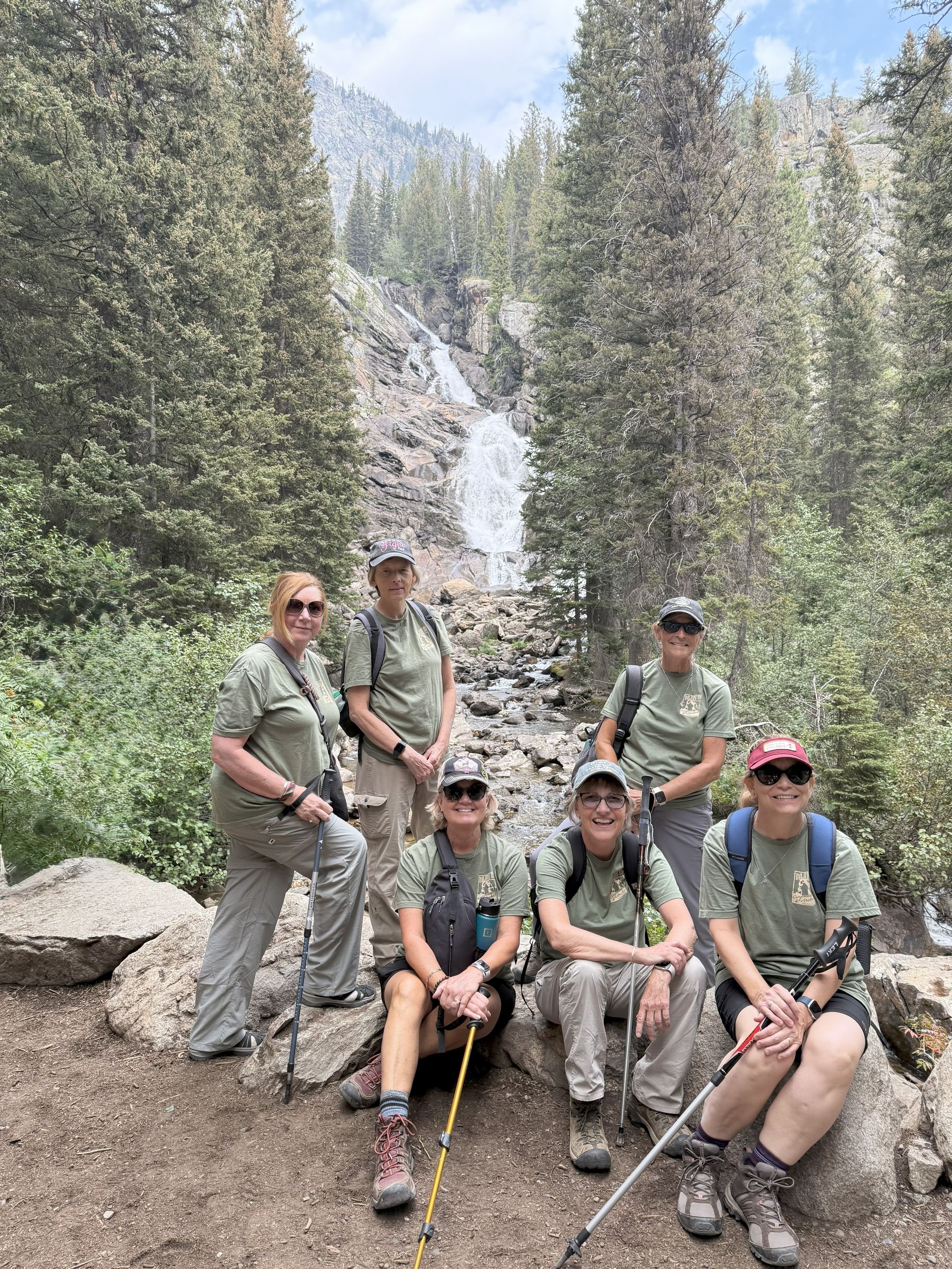 About 1/2 way to Hidden Falls we stopped to take a group picture at a rock slide. Our shirts were about the same color as the rocks and foliage and we are almost camouflaged.