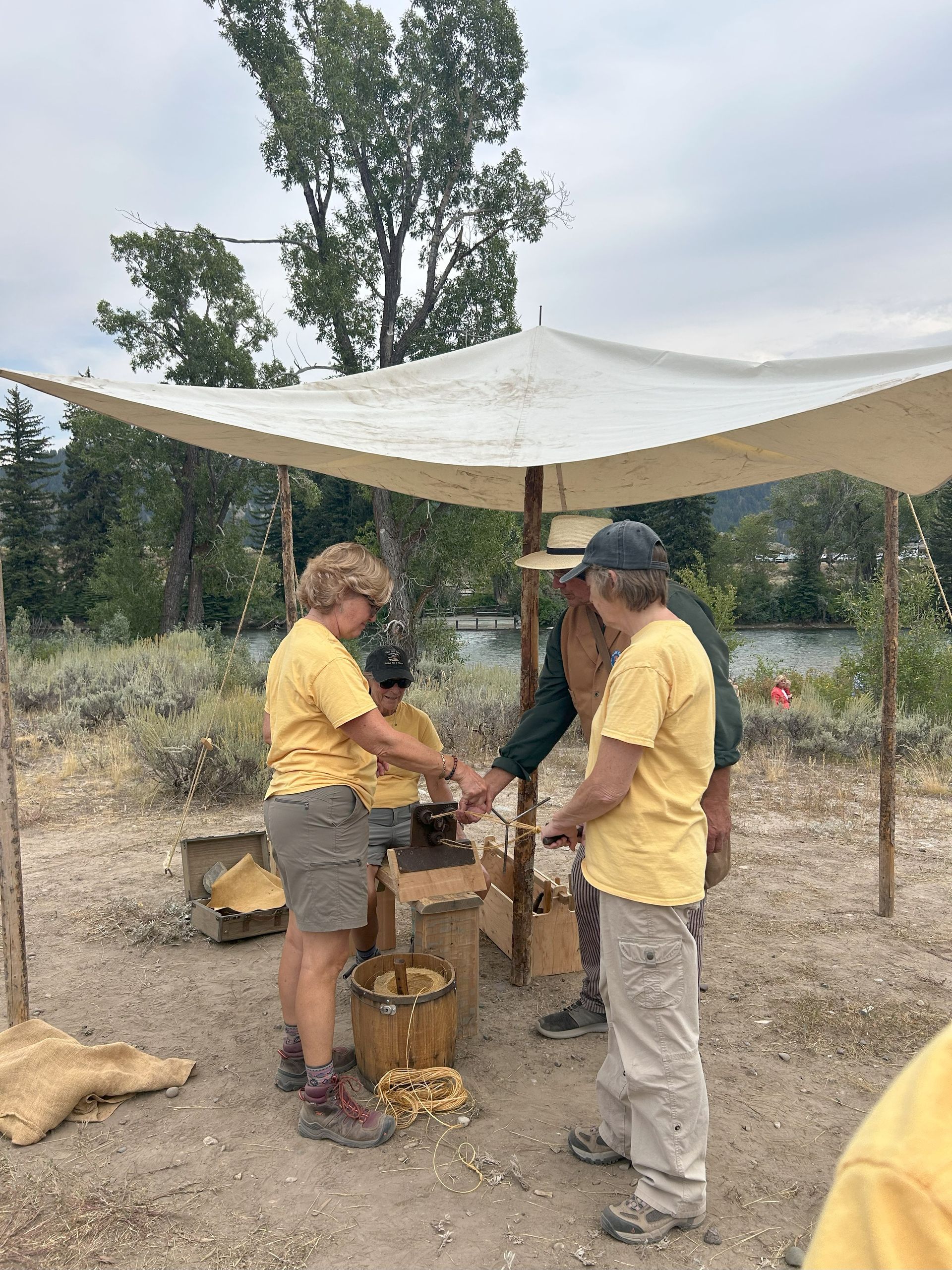 We met a man who showed us the first wheelbarrow which was actually called the Studebaker. He also showed us several hatchets and then how to make rope.