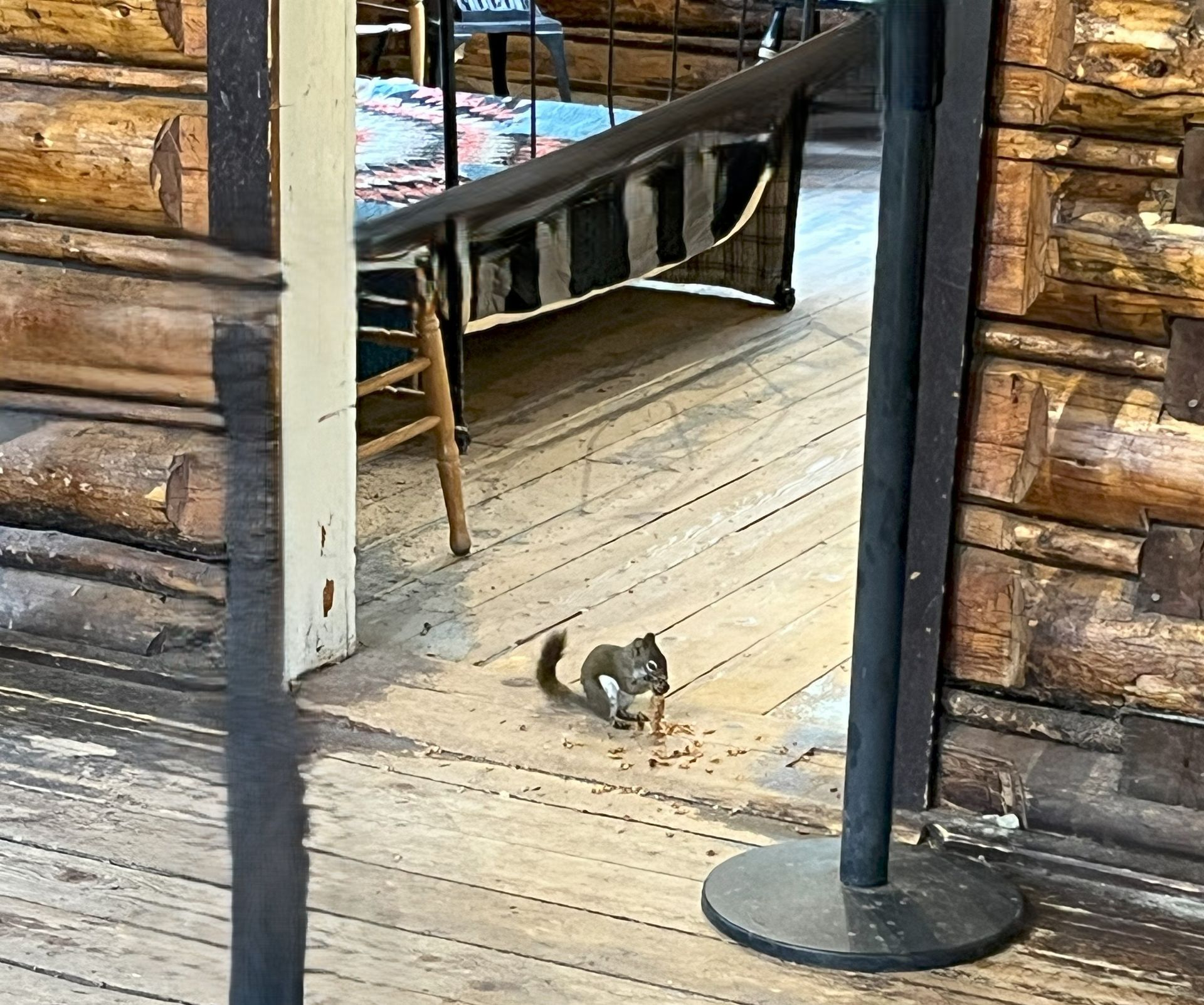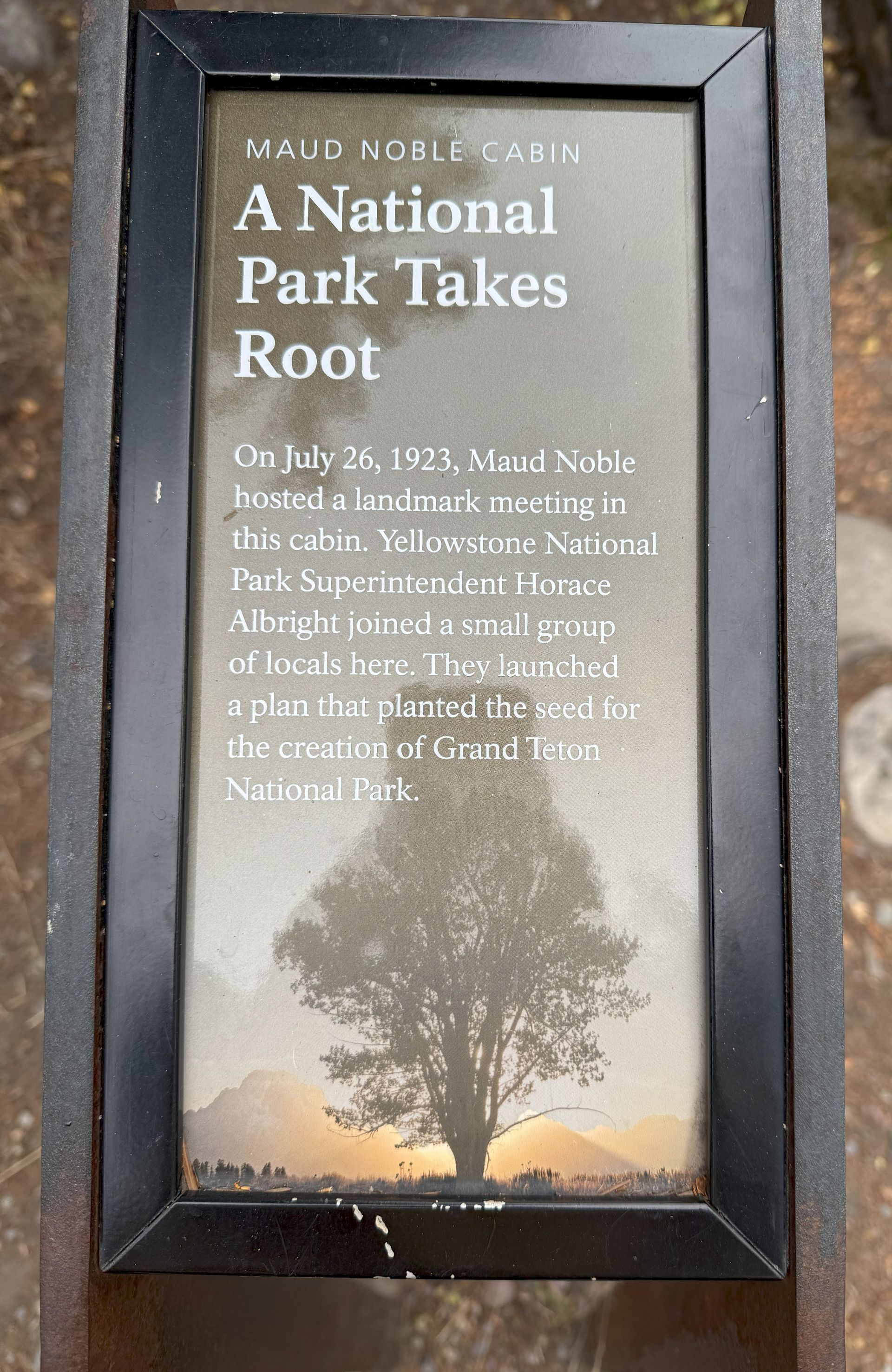 The last land mark was the Maud cabin where Yellowstone superintendent Horace Albright met with locals and decided to create Grand Teton Nnational Park on July 26 1923. We found a squirrel eating a pinecone in the doorway of the kitchen.
