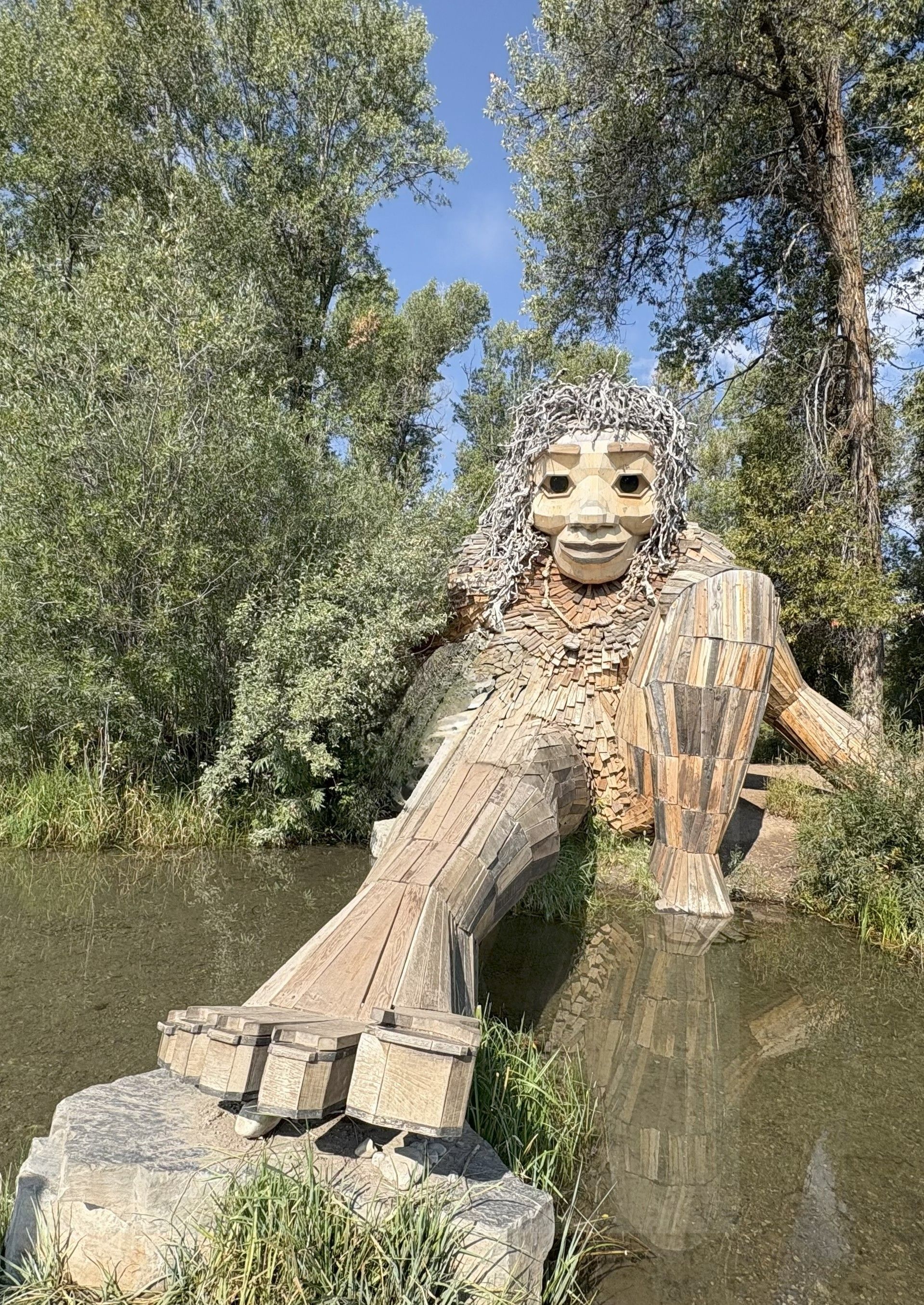 Slept in a little bit this morning because we have a really early morning tomorrow. Had a clean out the refrigerator breakfast and left at 10 o’clock for Wilson Wyoming. We are on search for our second Thomas Dambo sculpture. We saw our first 2 years ago in Seattle. This one is called Mama Mimi and was erected in 2021.
