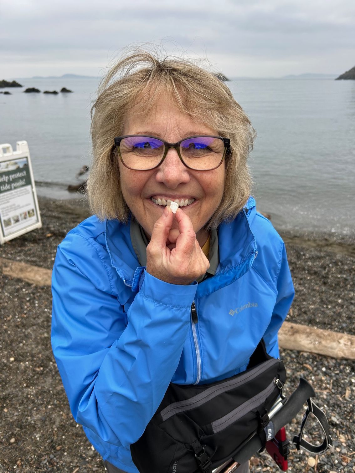 After lunch we went for about a walk down to Rosario Beach and saw where the tide pools would be but it’s high tide so they’re covered in water. We had fun anyway, and found some shells that look like they could be used for dentures. Peggy found some that really make her look long in the tooth. It was also a great place to skip rocks.